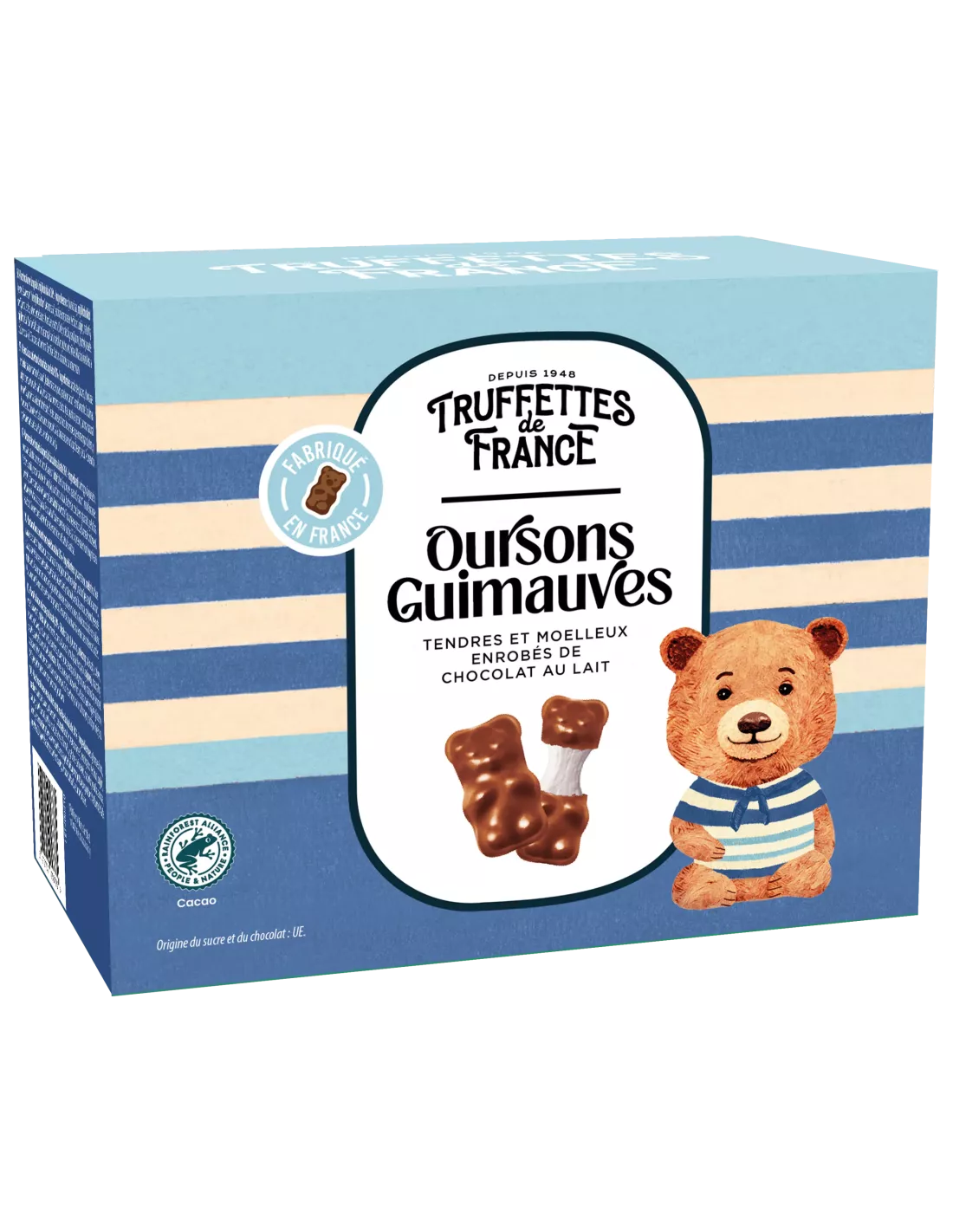 Ingredientes: jarabe de glucosa, chocolate con leche 30% (azúcar, manteca de cacao*, leche entera en polvo, pasta de cacao*, emulgente: lecitina(de soja), aroma natural de vainilla), azúcar, agua, dextrosa, azúcar glas, gelatina (de cerdo), aroma natural de vainilla, proteínas lácteas hidrolizadas. Puede contener trazas de cereales que contienen gluten, cacahuetes, frutos de cáscara y huevos. Chocolate con leche y azúcar: origen UE. Conservar en lugar fresco y seco.