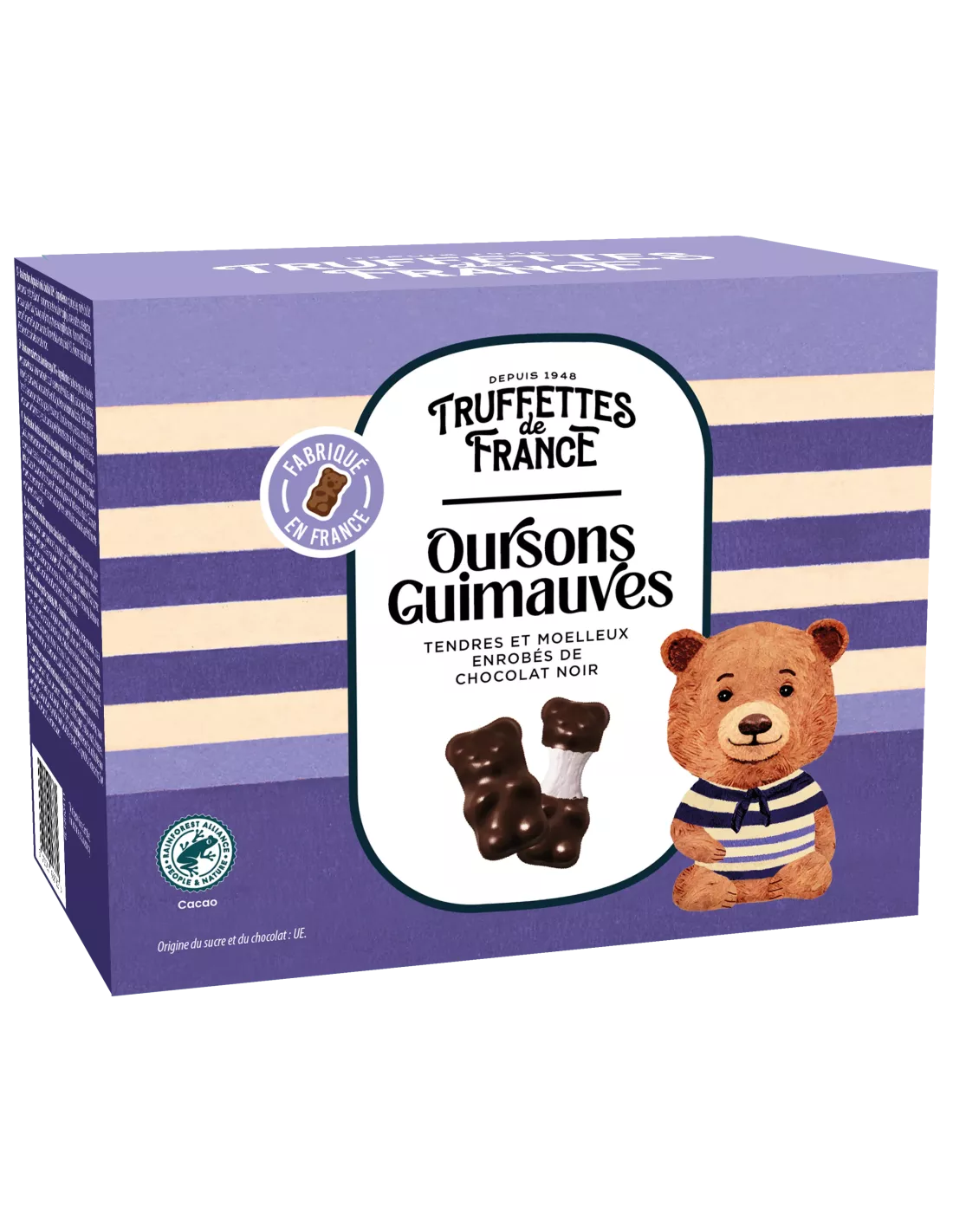 Ingredientes: jarabe de glucosa, chocolate con leche 30% (azúcar, manteca de cacao*, leche entera en polvo, pasta de cacao*, emulgente: lecitina(de soja), aroma natural de vainilla), azúcar, agua, dextrosa, azúcar glas, gelatina (de cerdo), aroma natural de vainilla, proteínas lácteas hidrolizadas. Puede contener trazas de cereales que contienen gluten, cacahuetes, frutos de cáscara y huevos. Chocolate con leche y azúcar: origen UE. Conservar en lugar fresco y seco.